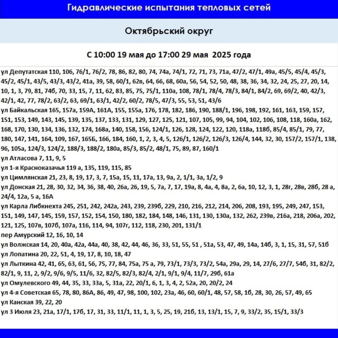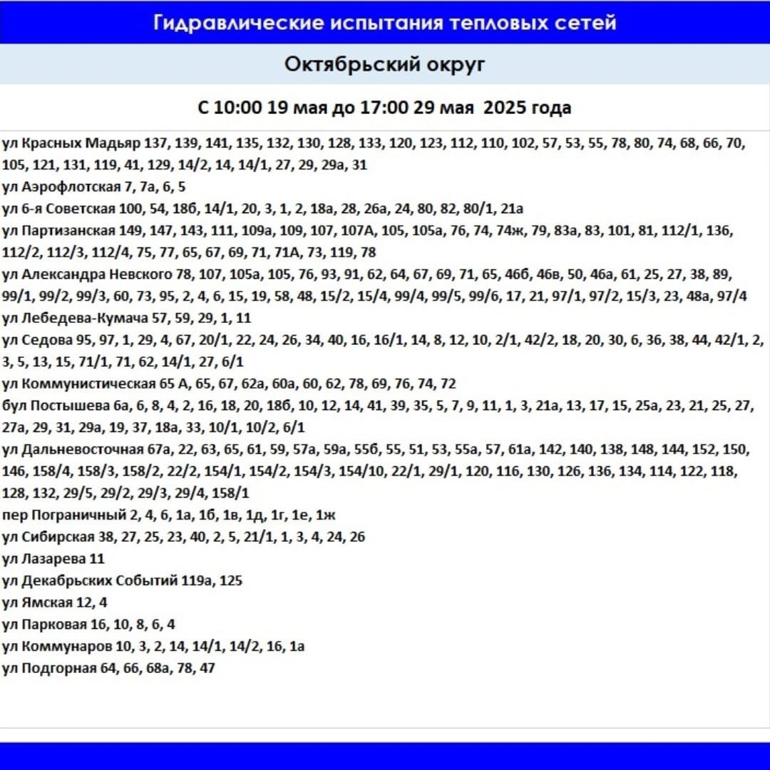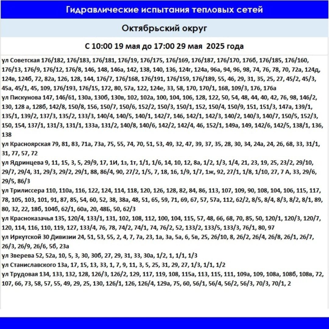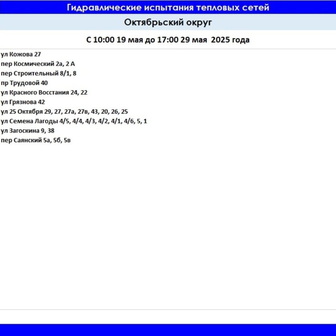 Горячее водоснабжение будет отключено в Октябрьском округе Иркутска с 10.00 19 мая до 17.00 29 мая. Специалисты приступают к проверке и ремонту оборудования.