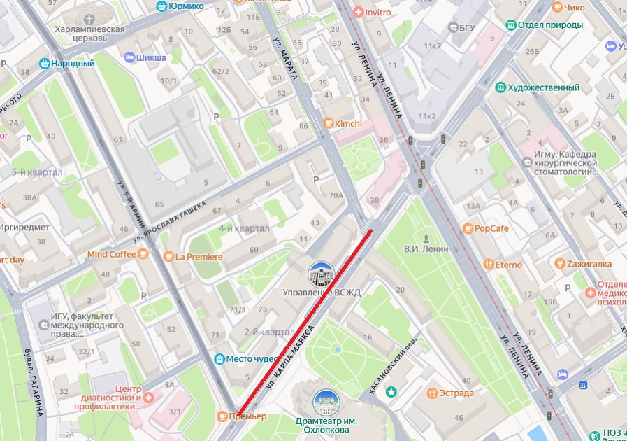 Движение транспорта по участку улицы Карла Маркса в Иркутске будет закрыто с 21.00 5 сентября до 6.00 8 сентября. Перекроют отрезок от 5-й Армии до Марата – там состоится фестиваль «Зодчество Восточной Сибири».