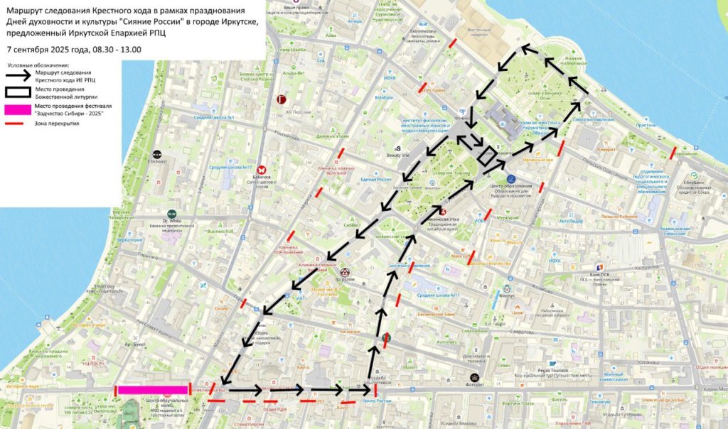 Кроме того, 7 сентября в центре города перекроют движение на время проведения крестного хода в рамках Дней русской духовности и культуры «Сияние России».